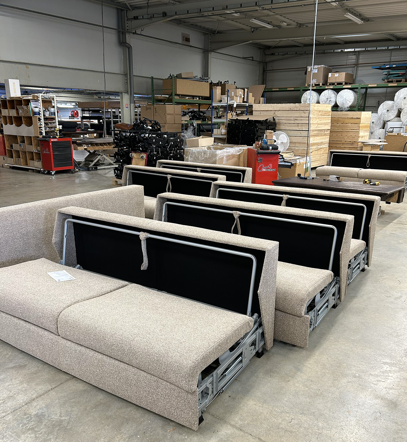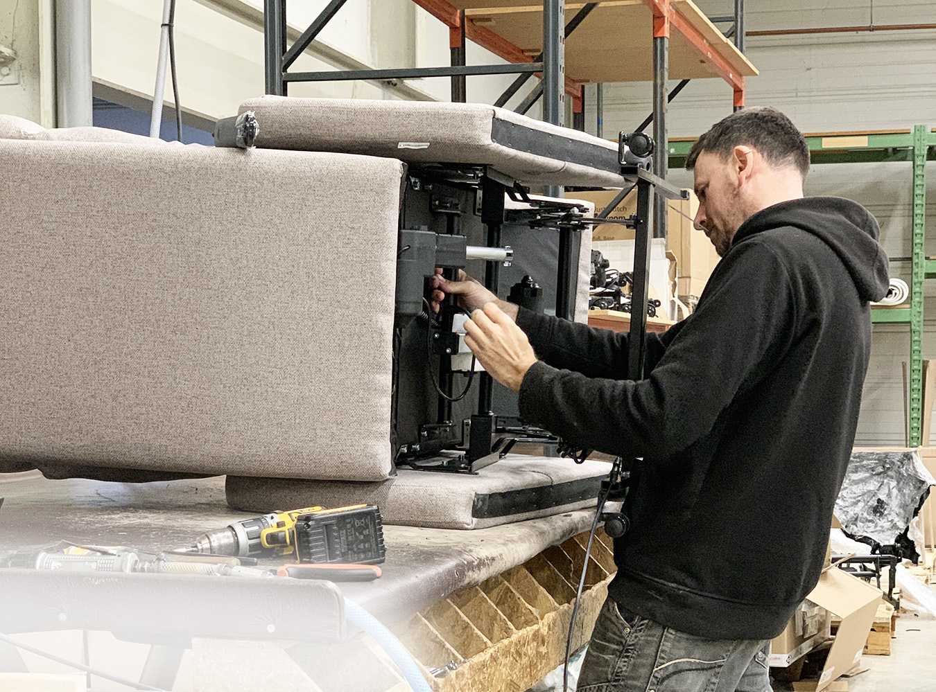 Nos techniciens associent la structure, les systèmes motorisés, les habillages et les accessoires. Chaque étape est contrôlée pour assurer une fluidité parfaite des mécanismes et une stabilité irréprochable.