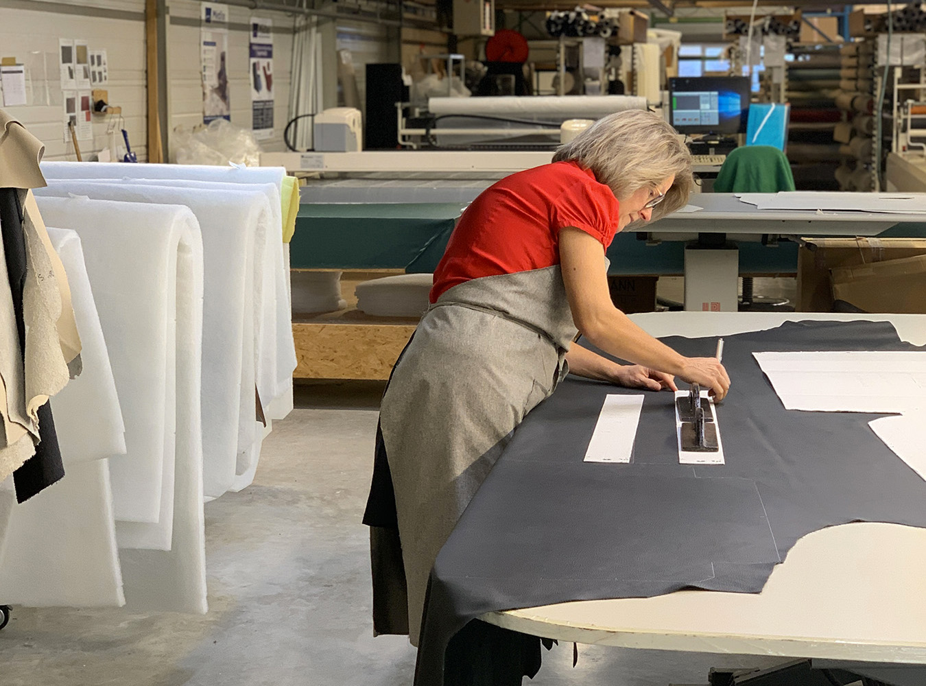 Les tissus sont découpés grâce à des gabarits précis, afin de garantir une régularité parfaite.